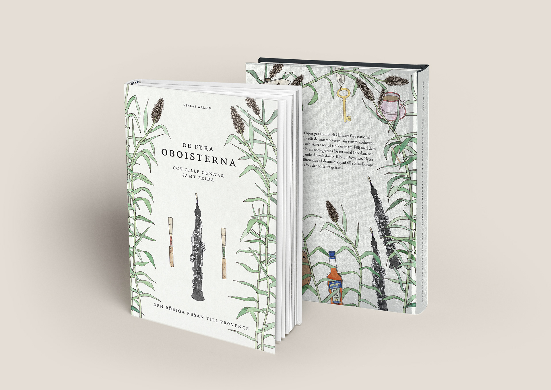 Bokomslag till "De fyra oboisterna och lille Gunnar samt Frida – Den röriga resan till Provence". Oboistdetaljer så som instrumentet, rören och Arundo Donax, samt detaljer på baksidan från bokens innehåll rörigt gömda i Arundo Donax-växter.