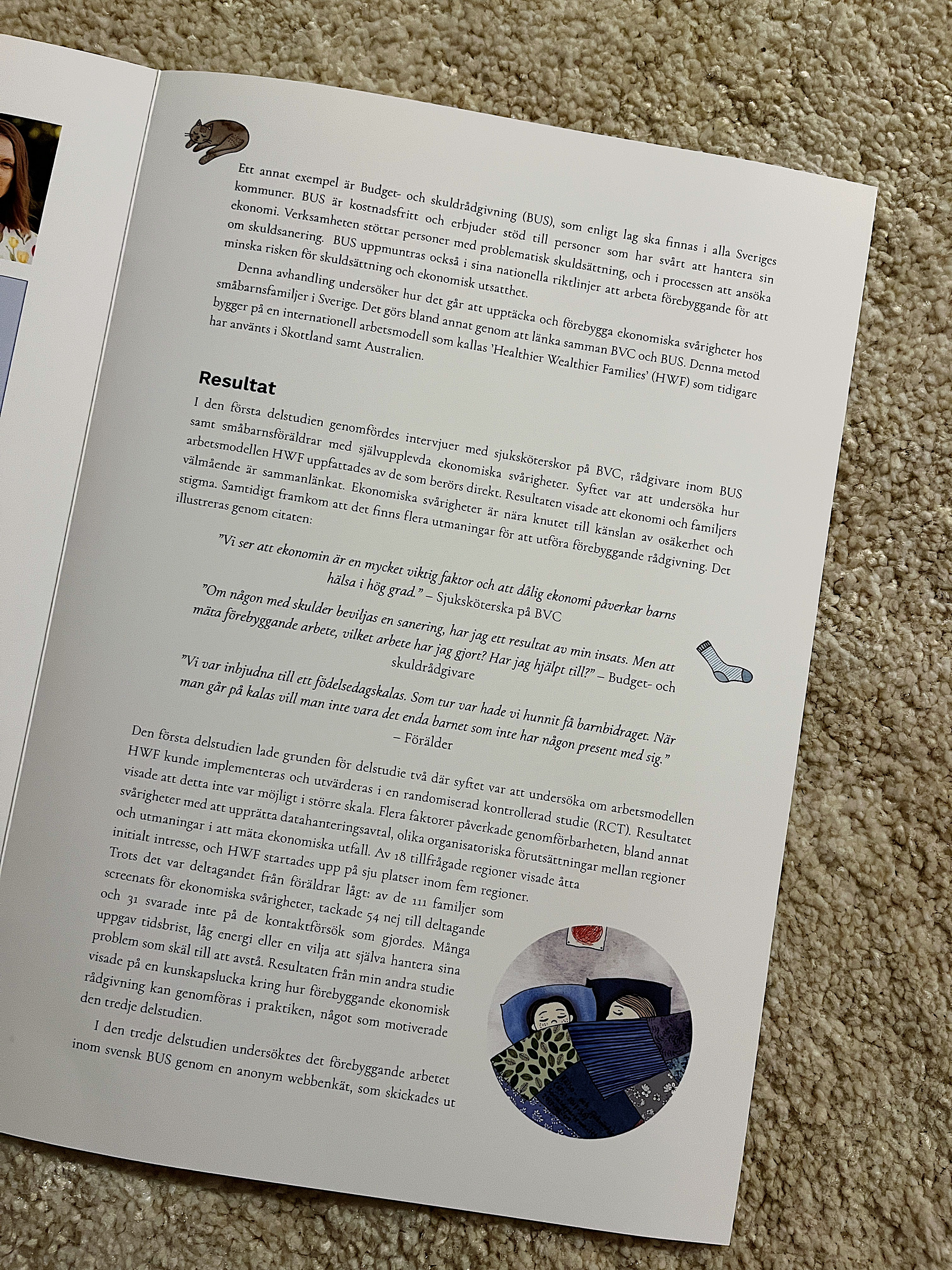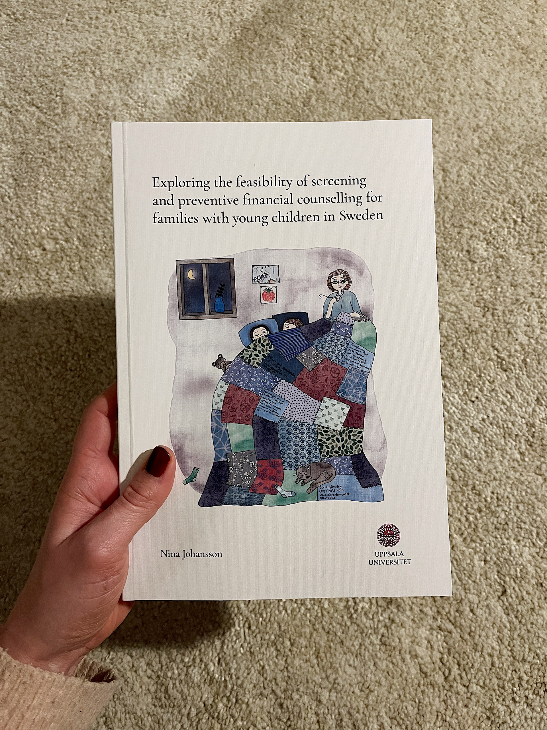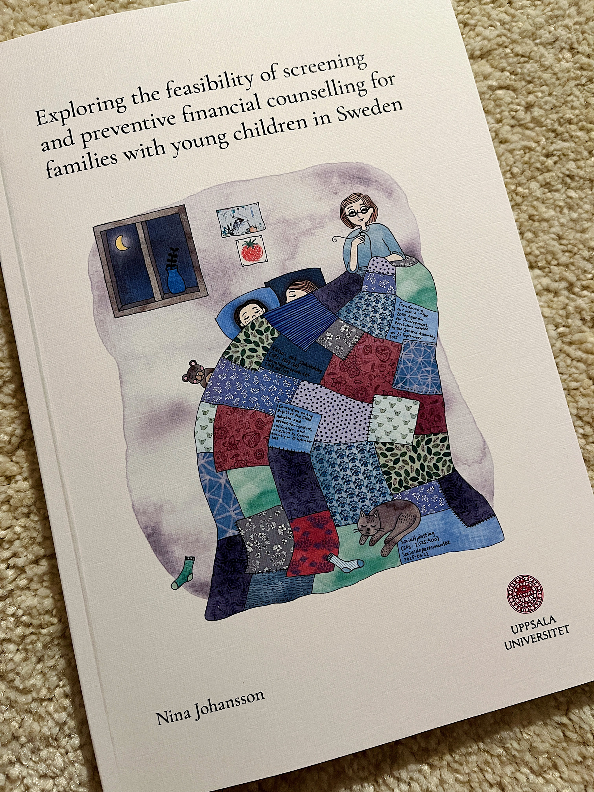 Illustration till en framsida av en doktorsavhandling vid Uppsala Universitet av Nina Johansson. Om förebyggande arbete och ekonomiska svårigheter hos småbarnsfamiljer i Sverige.