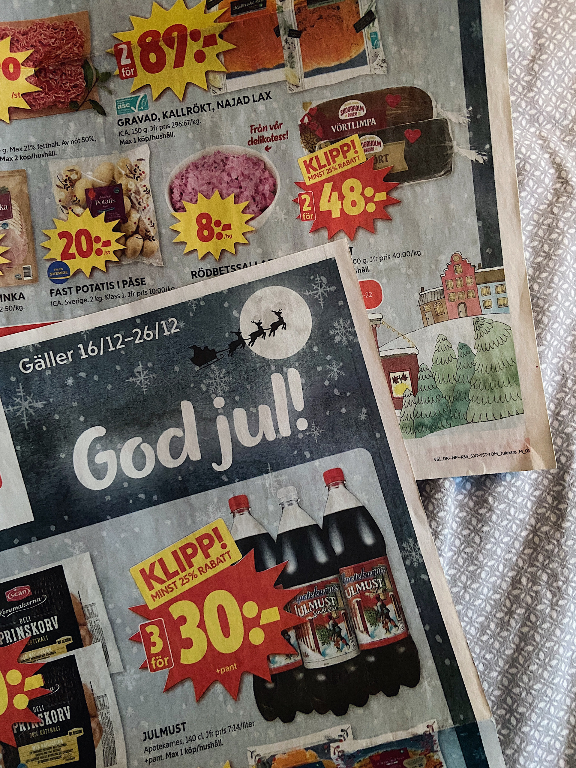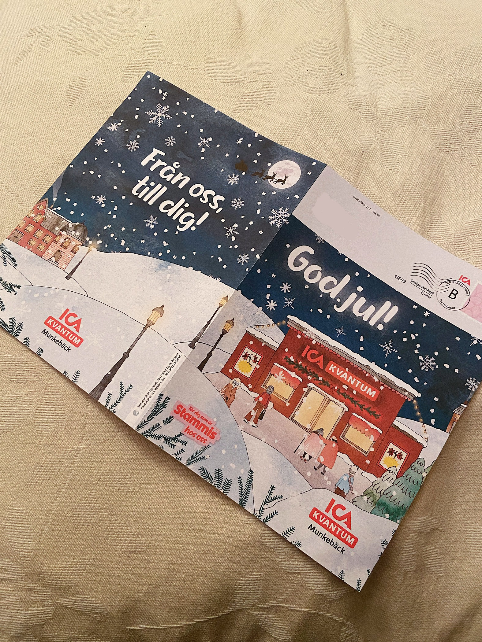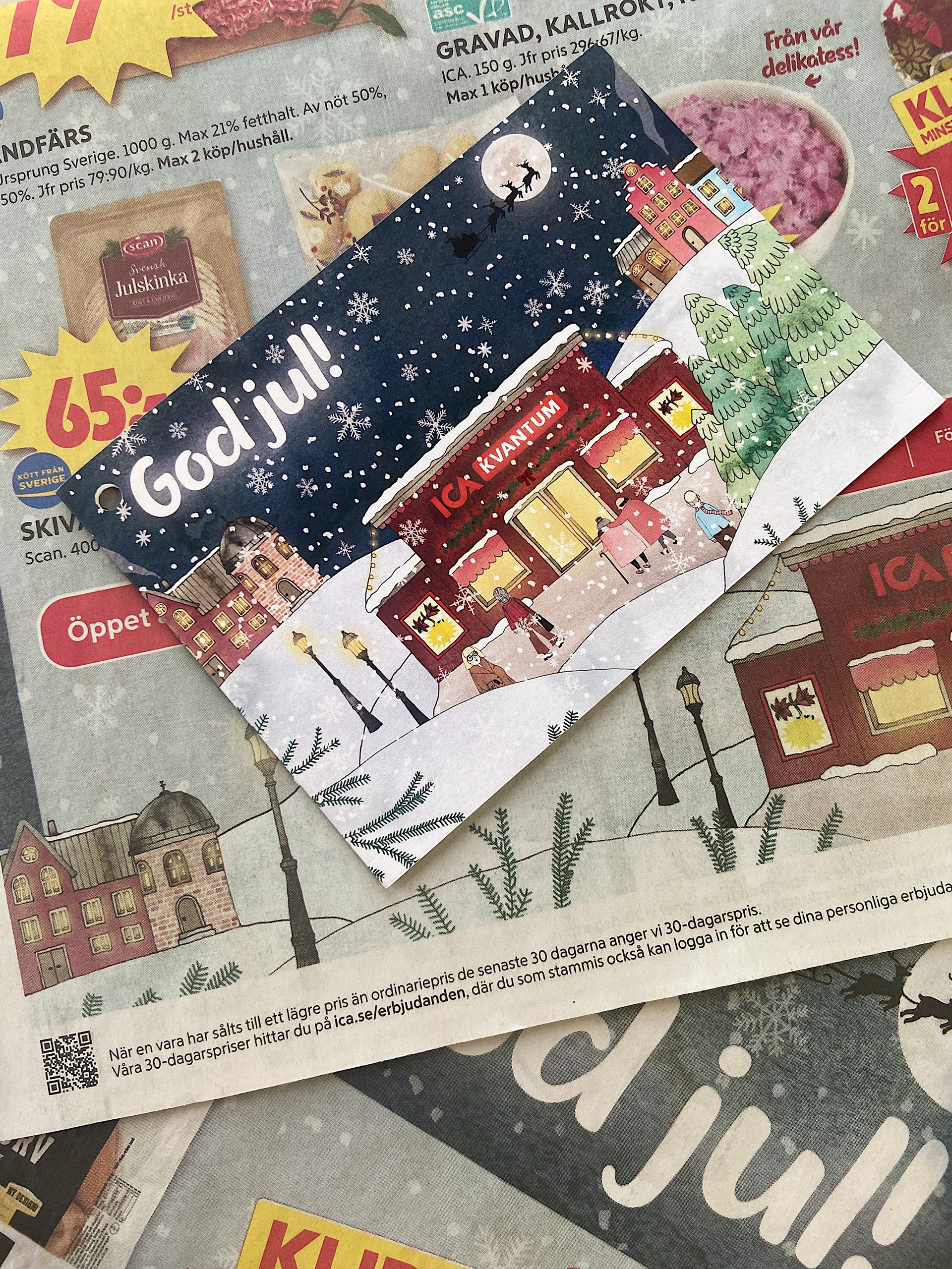 Jag fick i uppdrag att ta fram en julig illustration för ICA Kvantum. I ett första skede var det ett vykort som skulle skickas ut till en viss kundgrupp men det växte och blev även till en folder och som inramning till ett reklamblad.