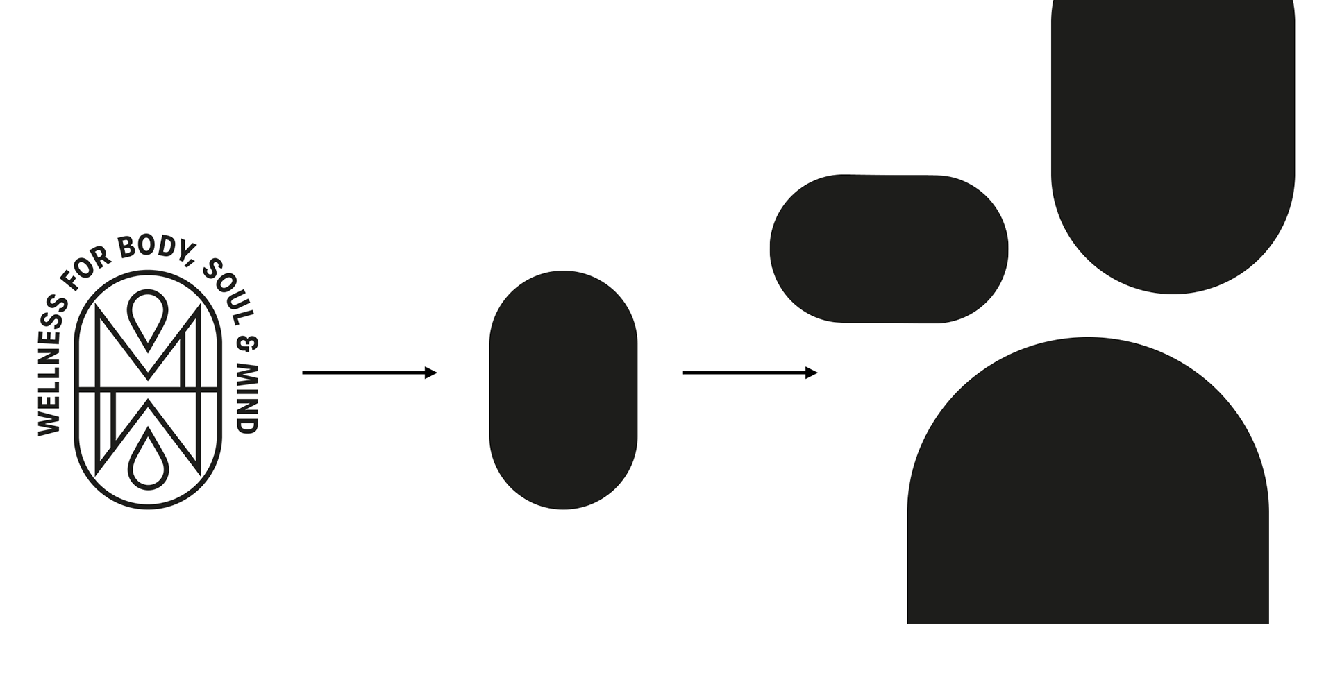 Det grafiska elementet utgår från formen i Mirelles logotyp. Den rundade formen kan användas på olika sätt, som en plupp för kortare budskap, som inramning eller som bakgrund. Det är ett lätt sätt att väva samman Mirelles olika uttag för att skapa igenkänning samtidigt som det funkar bra ihop med symbolen i logotypen.