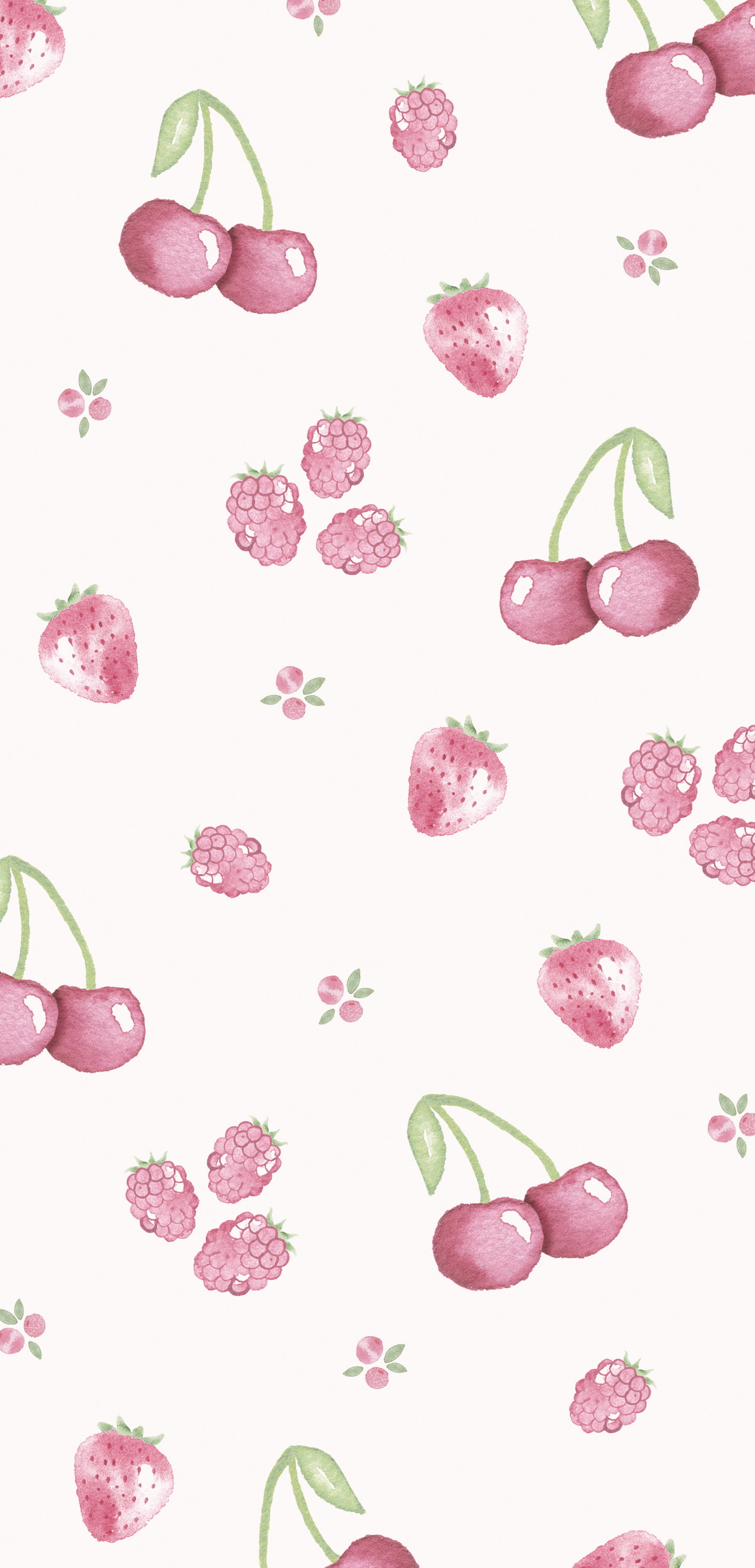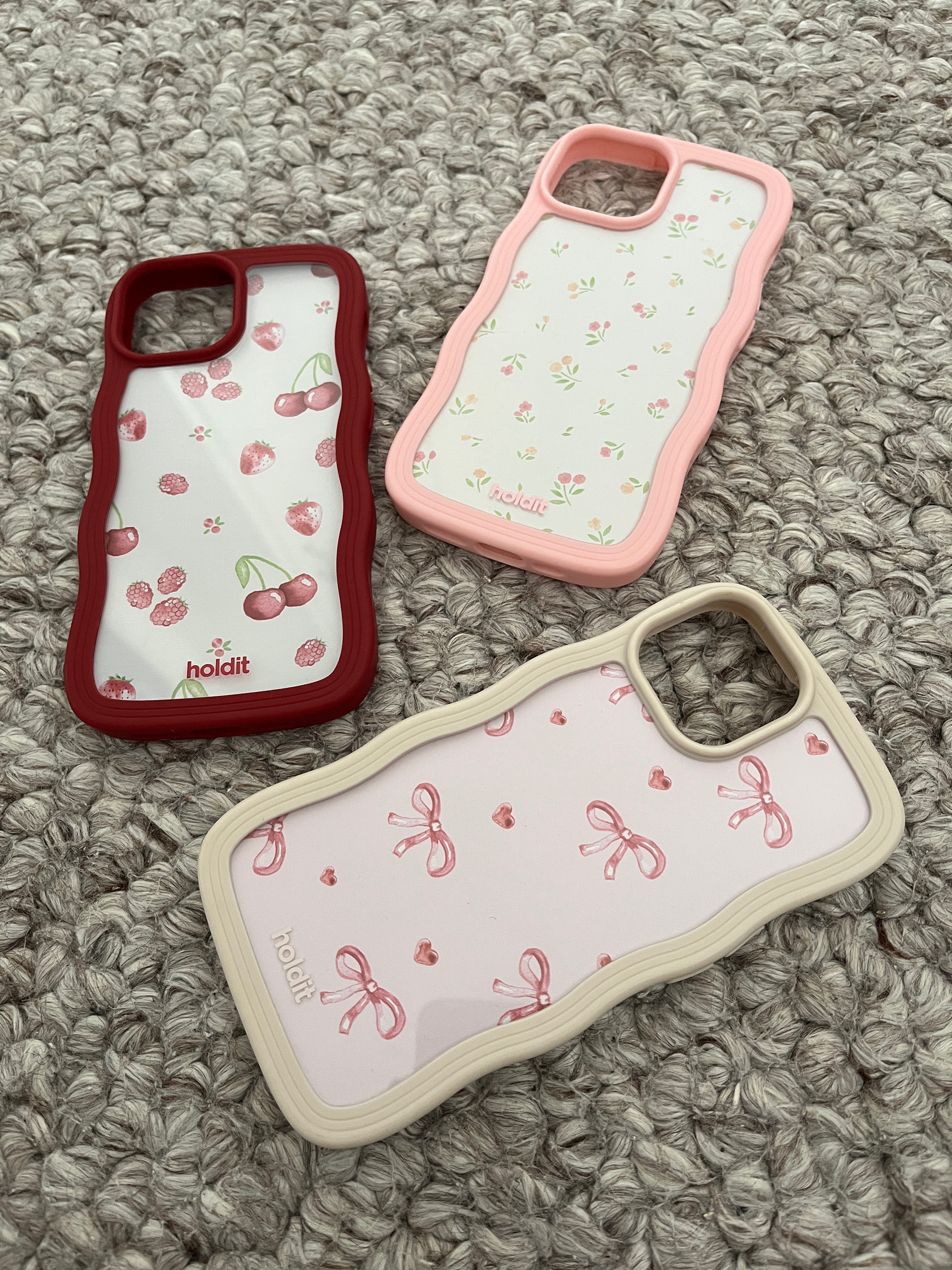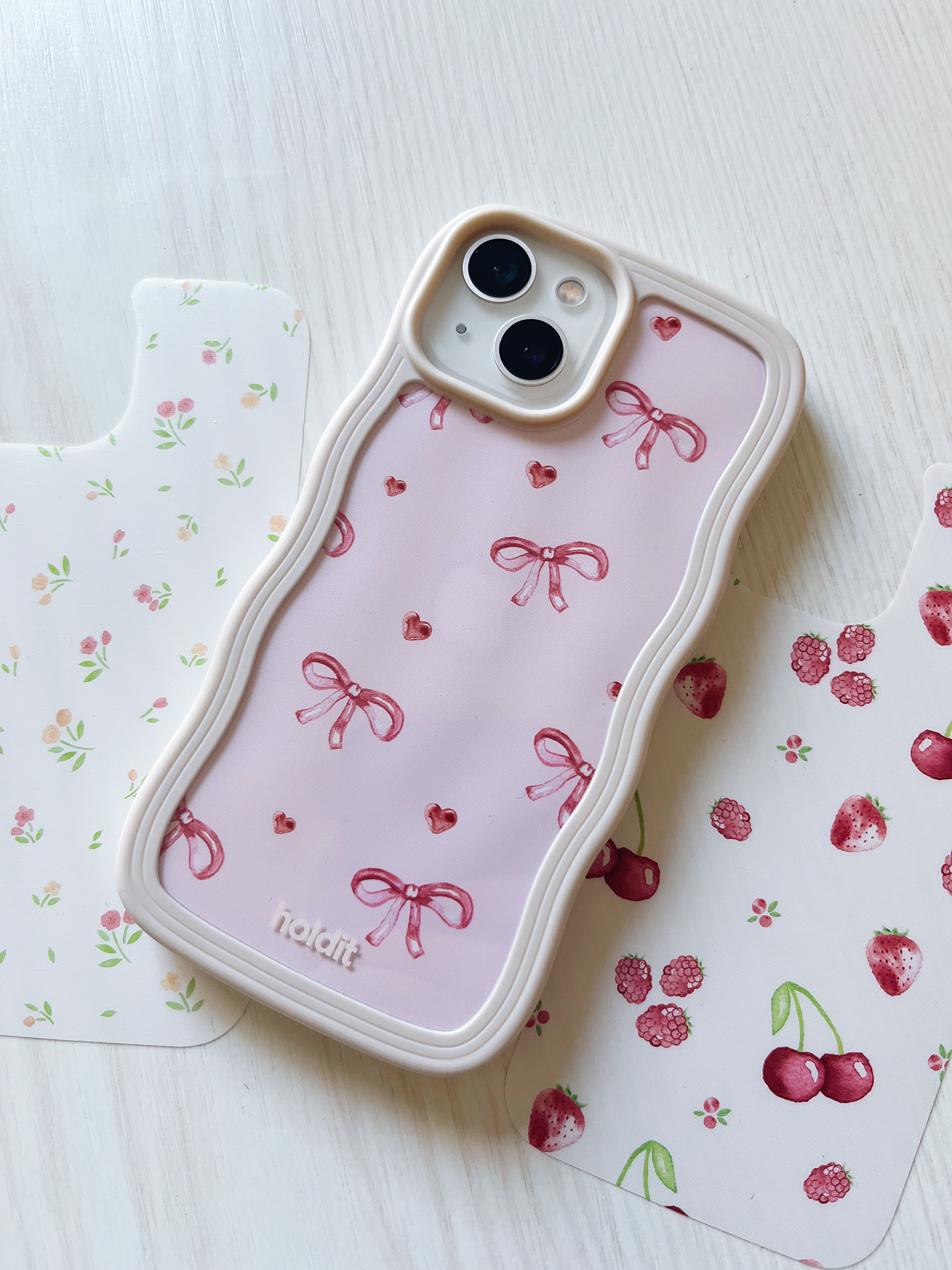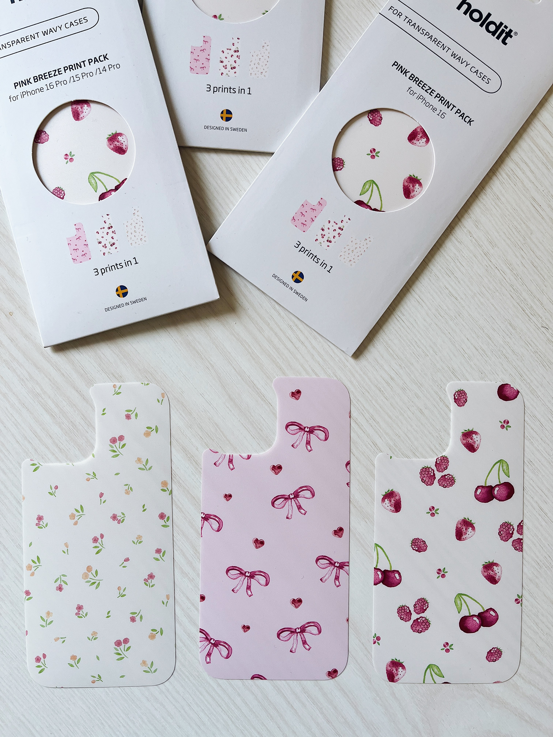Illustrerade mönster i akvarell till print packs för mobilskal. Uppdrag för Holdit som lanserades våren 2025. Vårigt och somrigt tema med blommor, rosetter och frukter som motiv.