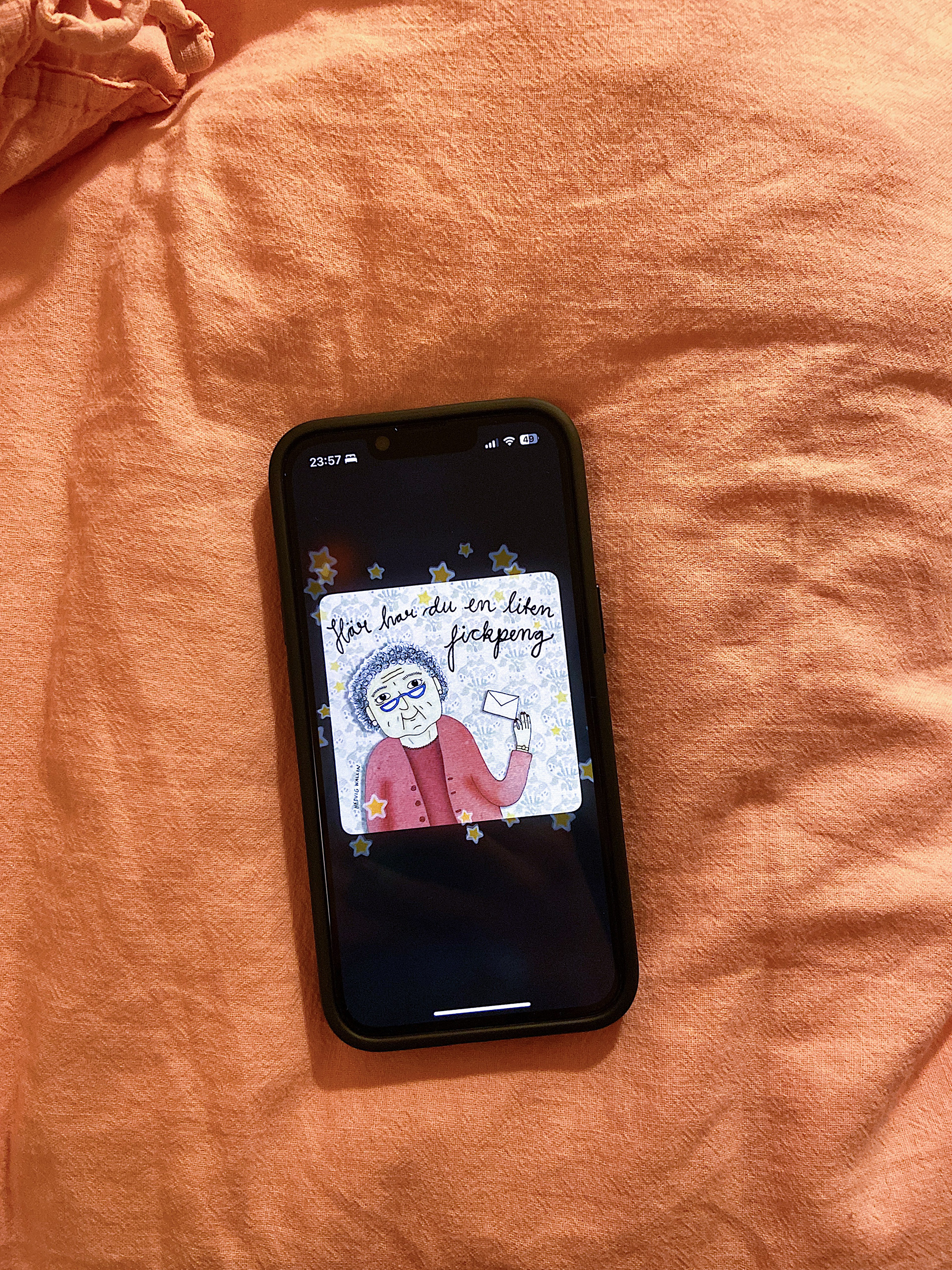 I min bild ville jag fånga en nostalgisk känsla från barndomen då man hade besökt mor- eller farföräldrarna och på något mystiskt sätt alltid fick med sig en liten peng hem, gärna gömt i ett vitt kuvert. Fickpengen behövde inte vara stor, men känslan av att ha något alldeles eget att spendera var magisk. En frihet att kanske köpa lite godis från kiosken eller lägga i spargrisen för en framtida dröm. Och nuförtiden får man väl mest fickpengar via swish, så då tyckte jag att den här bilden kunde passa!